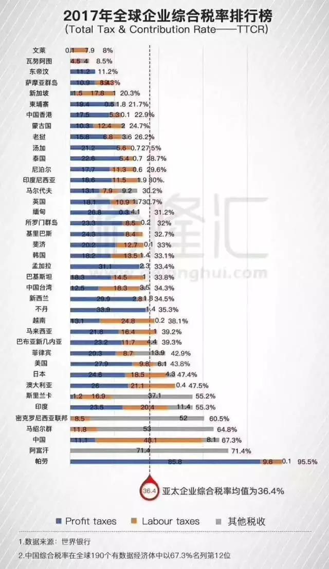 其實(shí)在去年年末,世界銀行聯(lián)合普華永道會(huì)計(jì)師事務(wù)所發(fā)布的《繳稅2017》(Paying Taxes 2017)的專題報(bào)告中,對(duì)全球190余個(gè)經(jīng)濟(jì)體的企業(yè)稅收負(fù)擔(dān)進(jìn)行了分析。在全球企業(yè)總稅率(Total Tax Rate)的排行榜中,中國(guó)以68%的稅收負(fù)擔(dān)排在第12位,比2015年上升一位,遠(yuǎn)遠(yuǎn)超過世界平均40.6%的總稅率水平。
